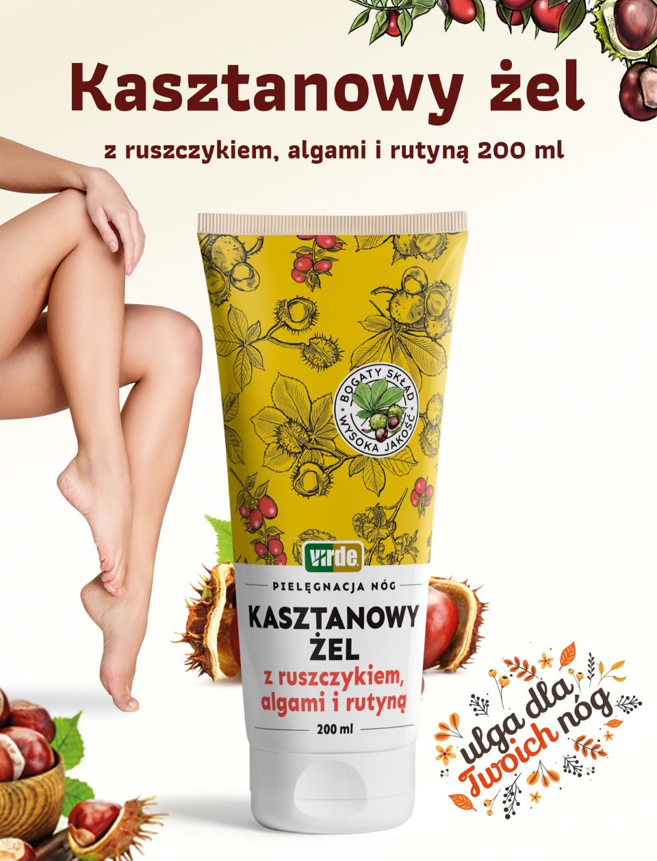 Kasztanowy żel z ruszczykiem, algami i rutyną przeznaczony jest do codziennej pielęgnacji nóg. Zapobiega i redukuje niedoskonałości skóry, wspiera produkcję kolagenu, lamininy i elastyny.